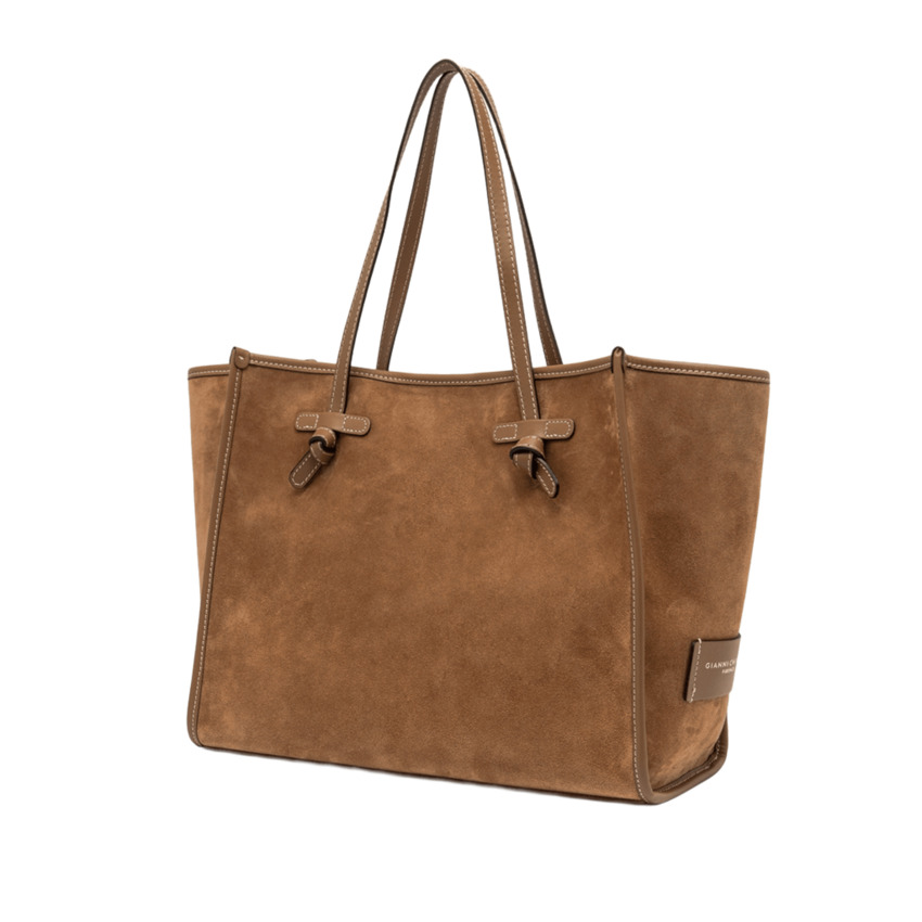 Questa versione della shopping Marcella, dal design essenziale e contemporaneo, è realizzata in morbida pelle scamosciata. Dotata di manici in pelle e di una comoda chiusura magnetica, è ideale per lutilizzo quotidiano. La fodera interna e la pochette coordinata in pelle, in tinta con le finiture, ne valorizzano la praticità e leleganza sobria.