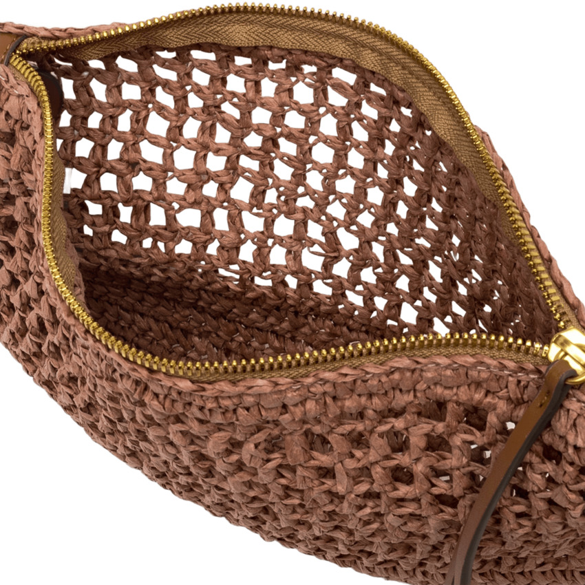 Nefeli è la nuova pouch di Gianni Chiarini Firenze dalla silhouette rettangolare, realizzata in paglia crochet. Presenta una chiusura con zip e dettagli in metallo che donano un tocco luminoso al design. Dotata di tracolla pratica e removibile per un utilizzo versatile.