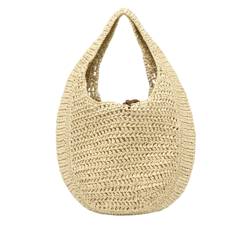 Nefeli è la nuova borsa hobo di Gianni Chiarini Firenze, realizzata in paglia crochet, presenta una chiusura con cordoncino e dettagli in metallo che donano un tocco luminoso al design.