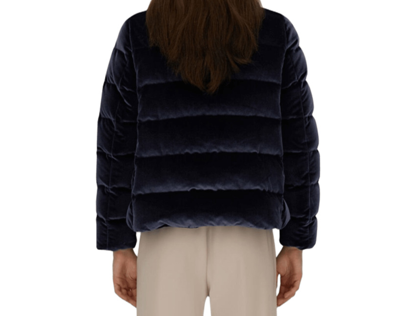 Giaccone da donna in velluto liscio stretch, collo alto, imbottitura in piuma, colore blu