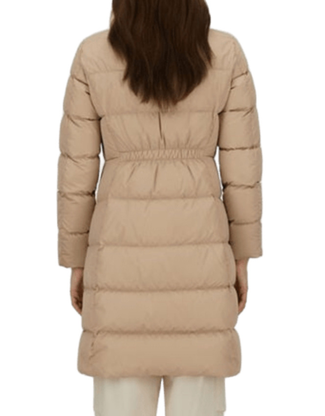 Giaccone lungo da donna in raso con collo in eco pelliccia, colore chantilly