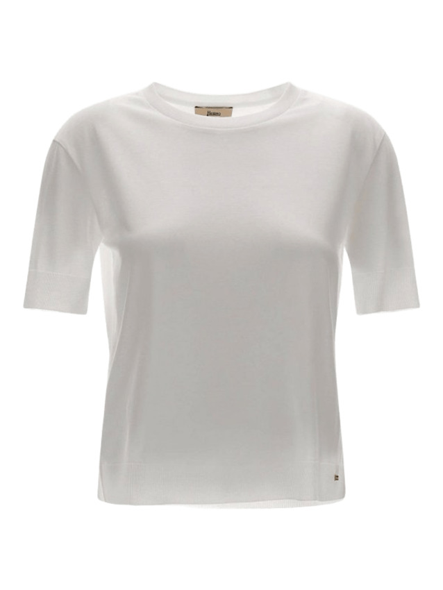 T-shirt girocollo in jersey di cotone leggero e morbido. Maniche corte, rifinita con dettagli lavorati a coste che conferiscono un aspetto tricot.
