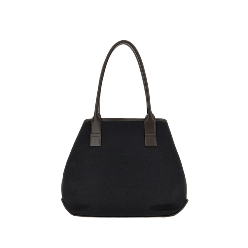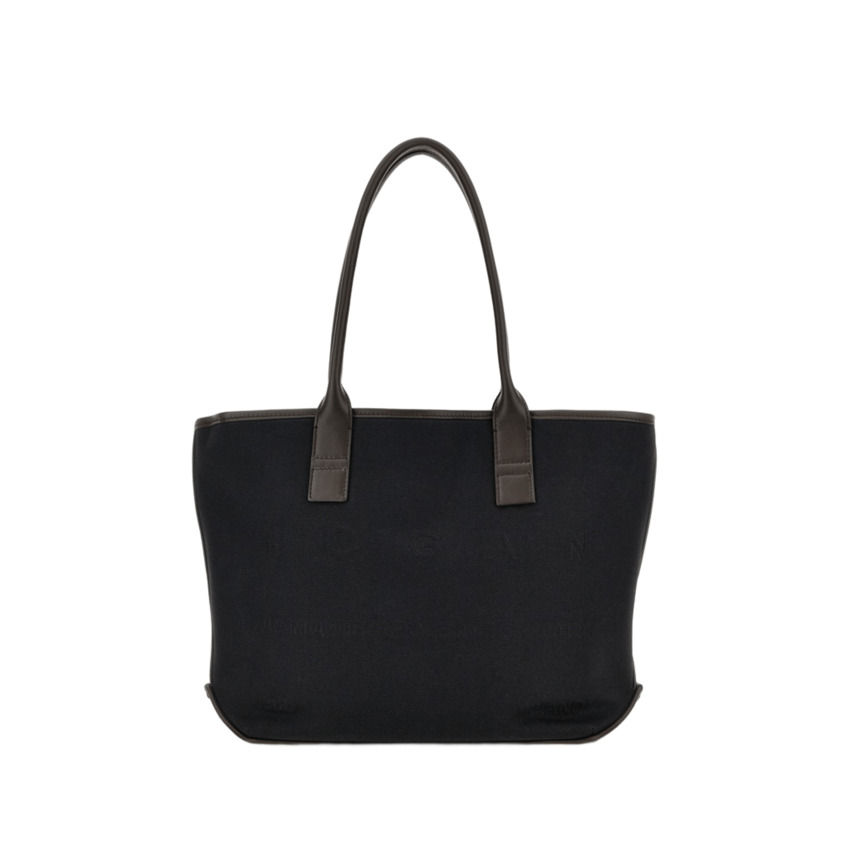 Borsa shopping da donna in canvas con l'indirizzo del brand in rilievo tono su tono, colore nero
