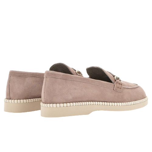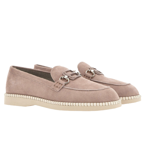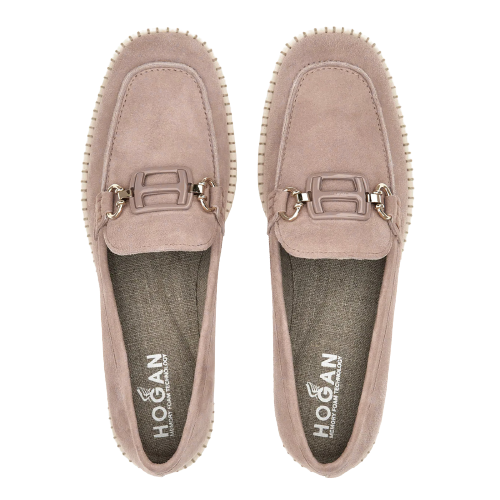 Mocassino H642 di Hogan è realizzato in pelle scamosciata con Fussbett morbido rivestito in lino. Presenta punta tonda, fodera in lino, dettaglio H smaltato e profilo in cordoncino. Suola in gomma light. Un modello dallo stile classico.