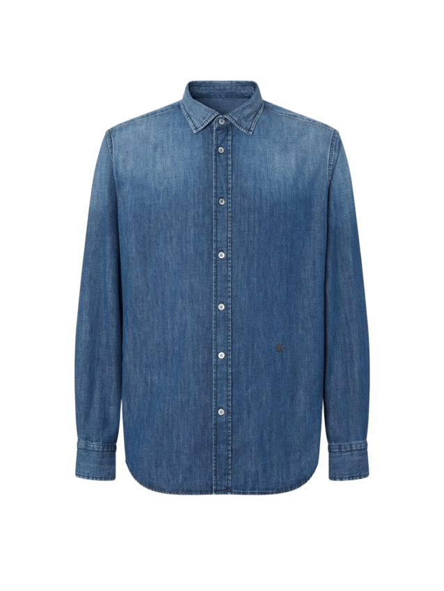 Camicia classica in denim leggero indaco di puro cotone blu medio stonewashed con sabbiatura a mano e texture morbida .