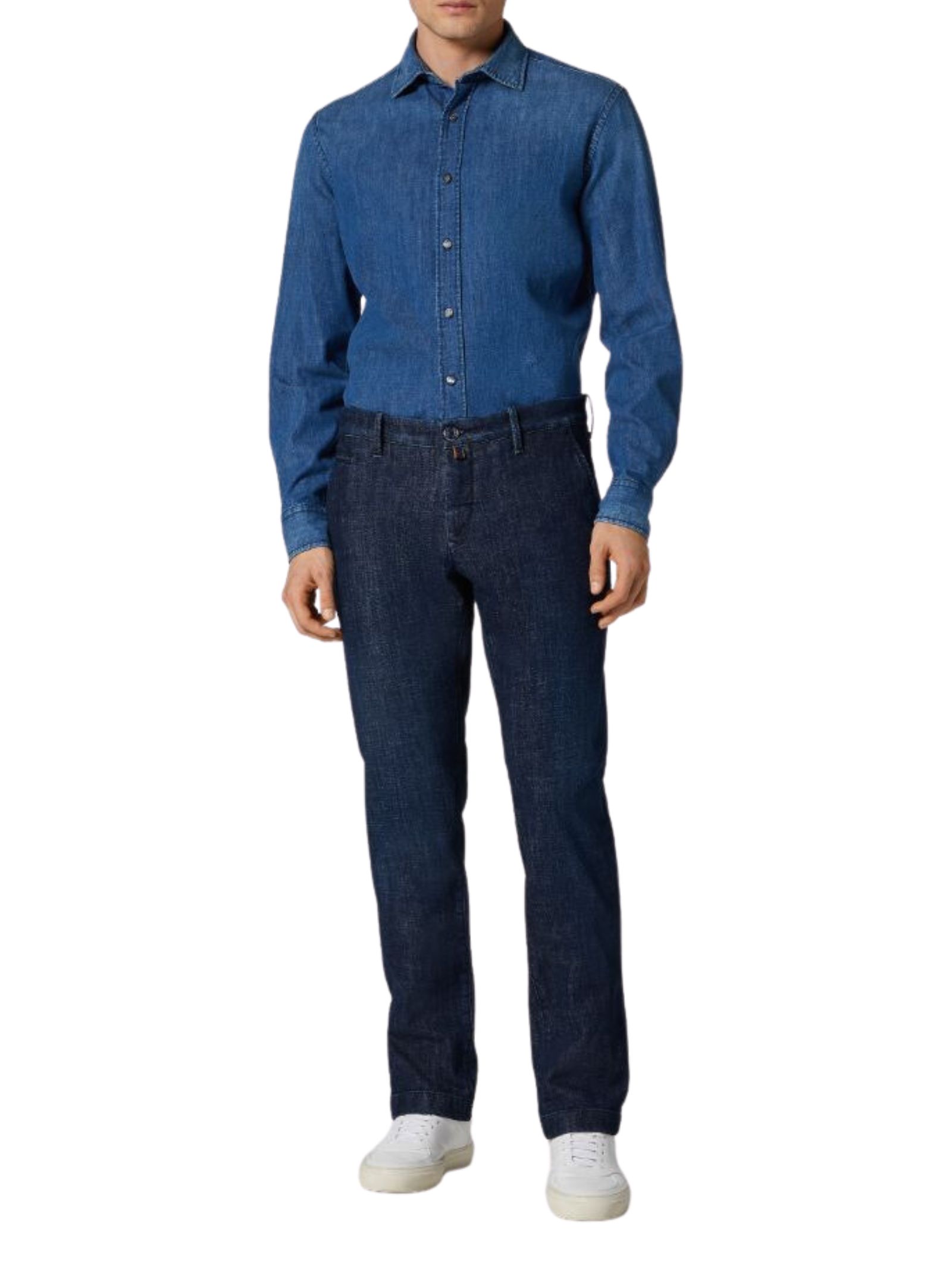 I Pantaloni Chino Slim di Bobby offrono un comfort ineguagliabile grazie all'esclusivo denim di cotone blu scuro dalla mano morbida. Grazie alla vita bassa, alla chiusura con bottone e zip e ai passanti per cintura, questo capo è moderno e alla moda. Inoltre, si caratterizza per le tasche alla francese sui lati, la piccola tasca a filetto sul fianco e le tasche posteriori a filetto chiuse da bottone.