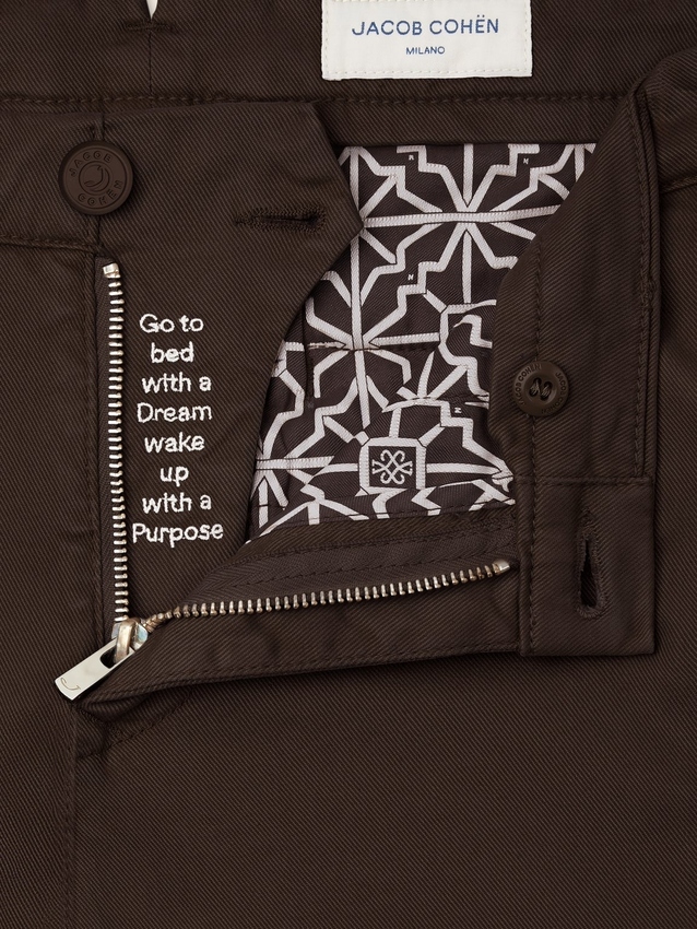 Patta interna ricamata con nome del pantalone e citazione del fondatore.