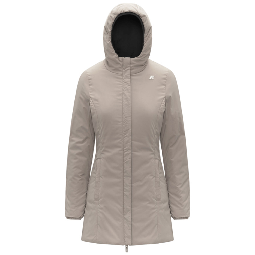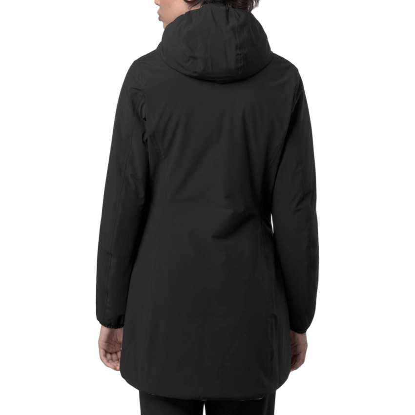 Giacca da donna con lunghezza a tre quarti che reinterpreta l'ispirazione funzionale K-Way in chiave femminile. Il modello combina un lato in poliestere elasticizzato impermeabile tinta unita e un lato in poliestere antivento dal colore a contrasto. L'imbottitura in ovatta offre un grado di calore medio, ideale per la mezza stagione, mentre le cuciture termonastrate isolano dal freddo e offrono maggiore comfort durante l'attività outdoor.