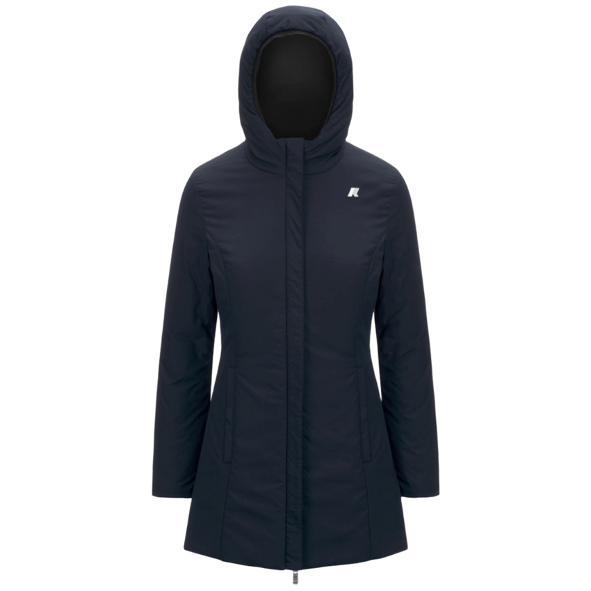 Giacca da donna con lunghezza a tre quarti che reinterpreta l'ispirazione funzionale K-Way in chiave femminile. Il modello combina un lato in poliestere elasticizzato impermeabile tinta unita e un lato in poliestere antivento dal colore a contrasto. L'imbottitura in ovatta offre un grado di calore medio, ideale per la mezza stagione, mentre le cuciture termonastrate isolano dal freddo e offrono maggiore comfort durante l'attività outdoor.
