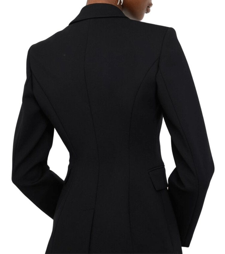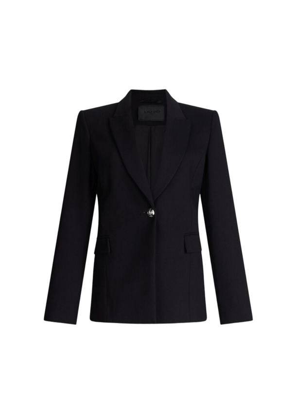 Blazer nero in jersey punto milano con rever classico, tasche con patta, spacchetto sul dietro e chiusura con bottone logato.