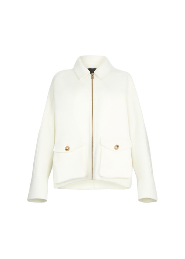 Caban in panno di misto lana con frange sul retro, collo a camicia, tasche con patta e bottone e polsi con bottoni. Chiusura con zip