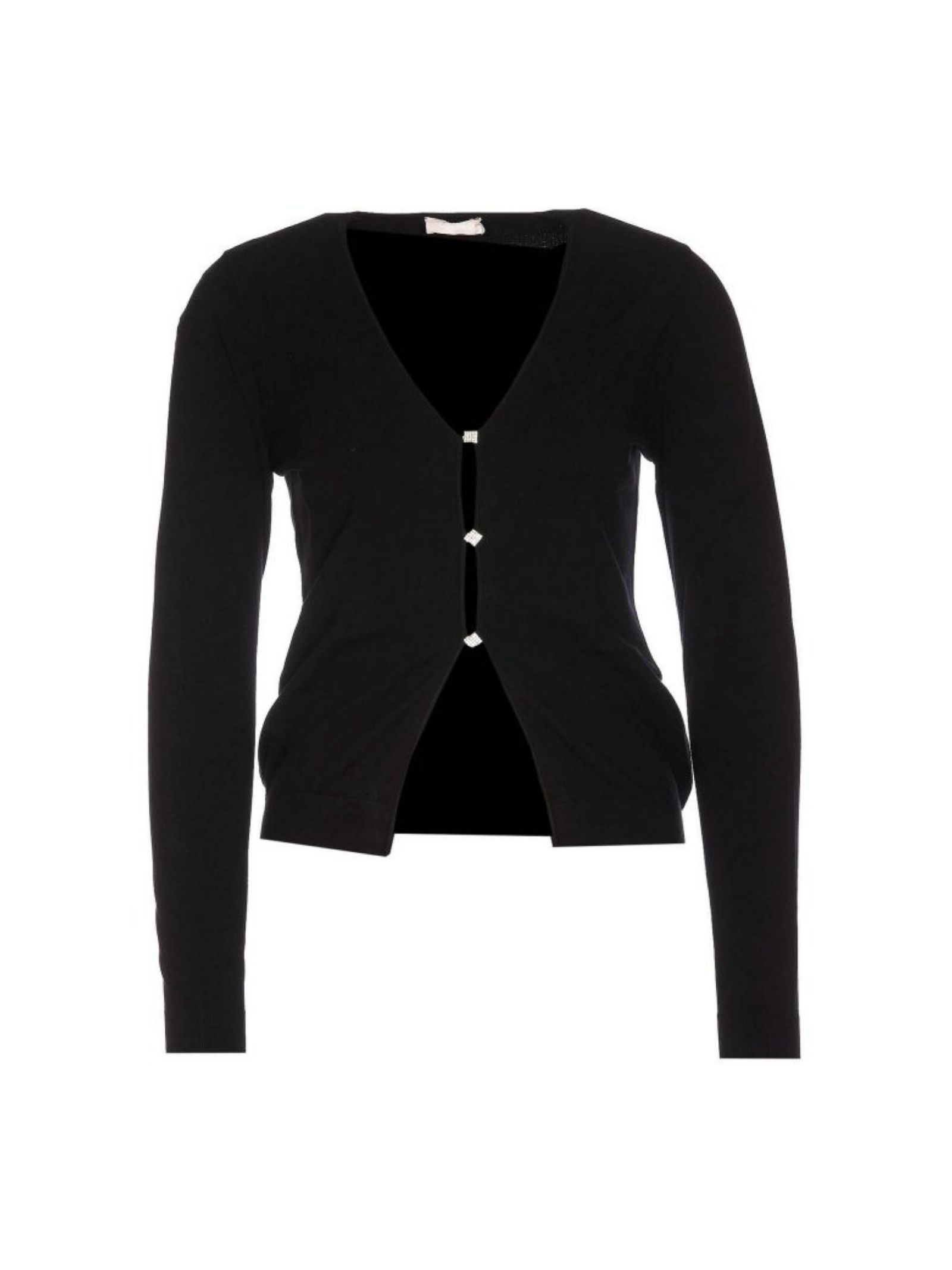 Il cardigan Liu Jo nero è un capo elegante e versatile, perfetto per le occasioni più formali o per un look casual. Le maniche lunghe, lo scollo a V frontale e i bottoni a gioiello conferiscono un tocco di classe e femminilità. Realizzato con materiali di alta qualità, garantendo un comfort e una vestibilità impeccabile.