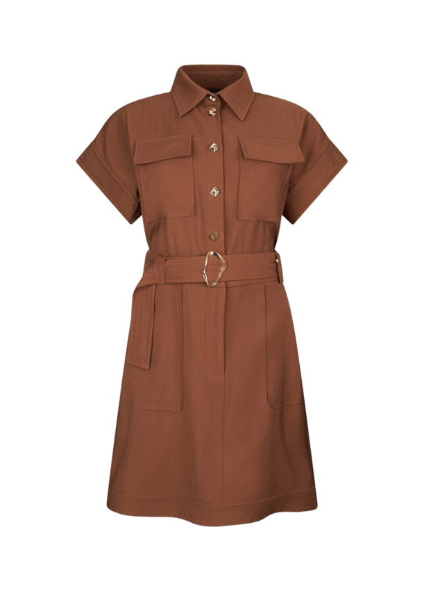 Un chemisier corto dal taglio impeccabile, con tasche frontali con patta, maniche corte, e chiusura con bottoni dorati. Una cintura in vita con fibbia decorativa scolpisce la silhouette.