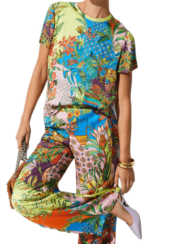T-shirt in raso di viscosa girocollo, maniche corte con spacchetti stondati. Stampa multicolor all-over.