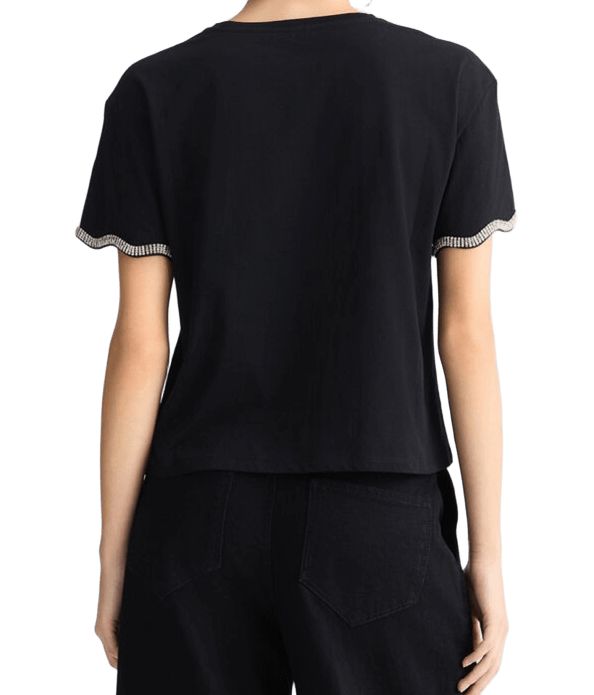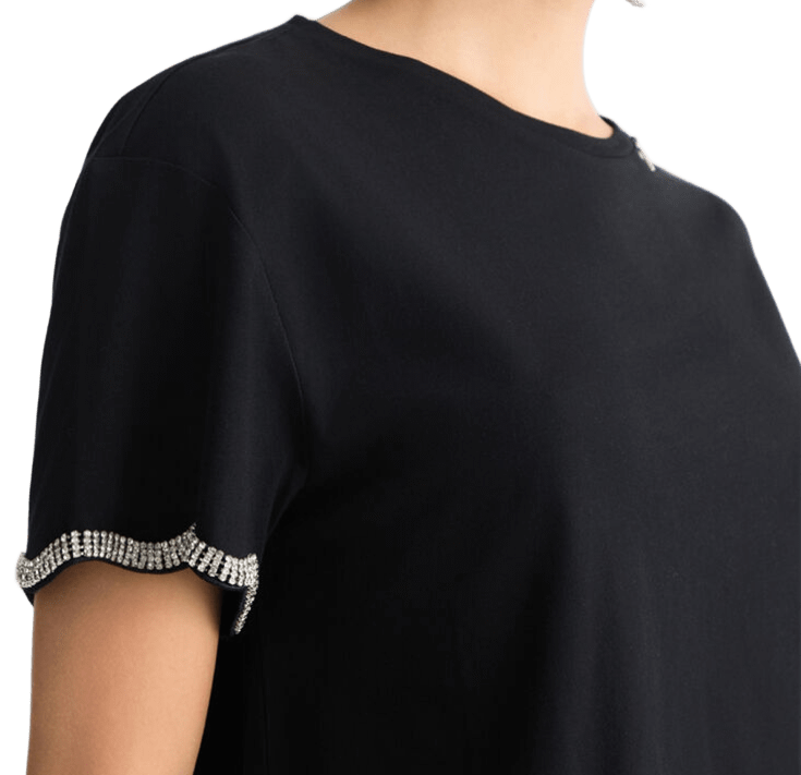 Onde sinuose e preziose si svelano attraverso le maniche di questa t-shirt girocollo a maniche corte in jersey di cotone con strass applicati.
