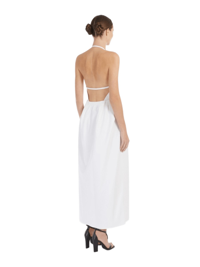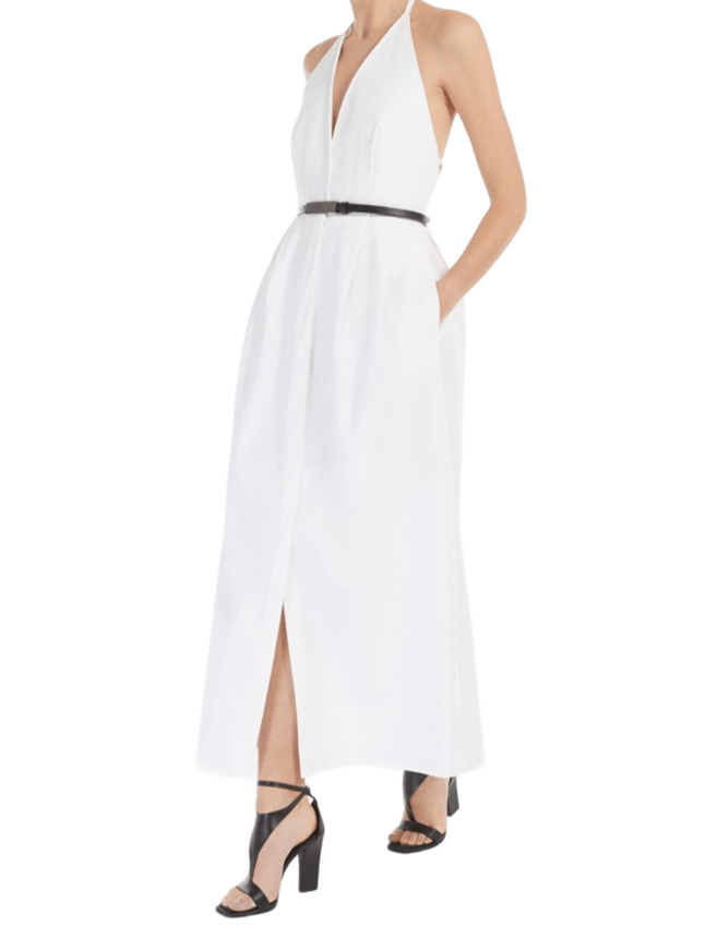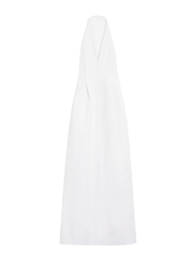 Abito lungo smanicato realizzato in gabardina di cotone stretch. Il modello è caratterizzato da scollo all'americana con schiena scoperta, taglio in vita e gonna ampia con pinces che donano volume al capo e tasche inserite nei fianchi. La cintura abbinata permette di evidenziare la silhouette. Chiusura frontale con bottoni nascosti.