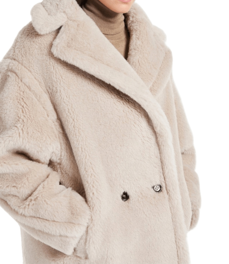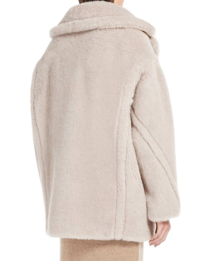 Cappotto in tessuto Teddy di alpaca e lana su base seta in versione corta sopra al ginocchio. Con ampio collo a rever, maniche lunghe a giro basso, chiusura doppiopetto con due bottoni a vista e tasche a filettone sui fianchi.
