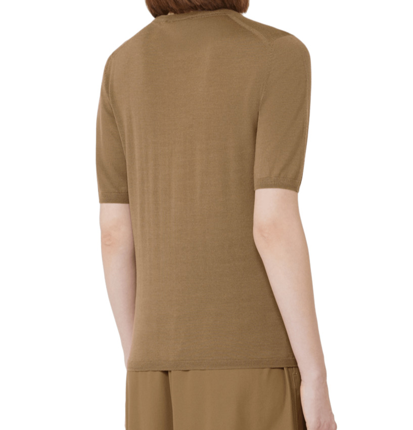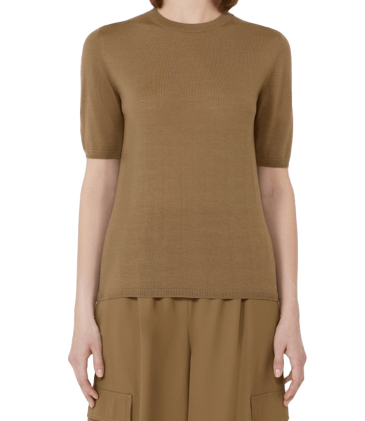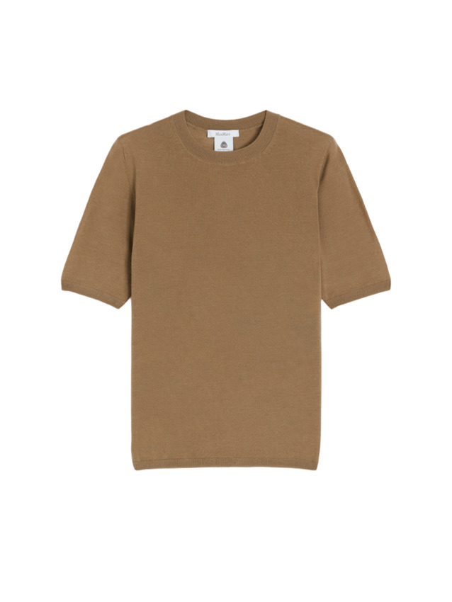 Maglia da donna in pura lana , girocollo, mezza manica, colore nocciola