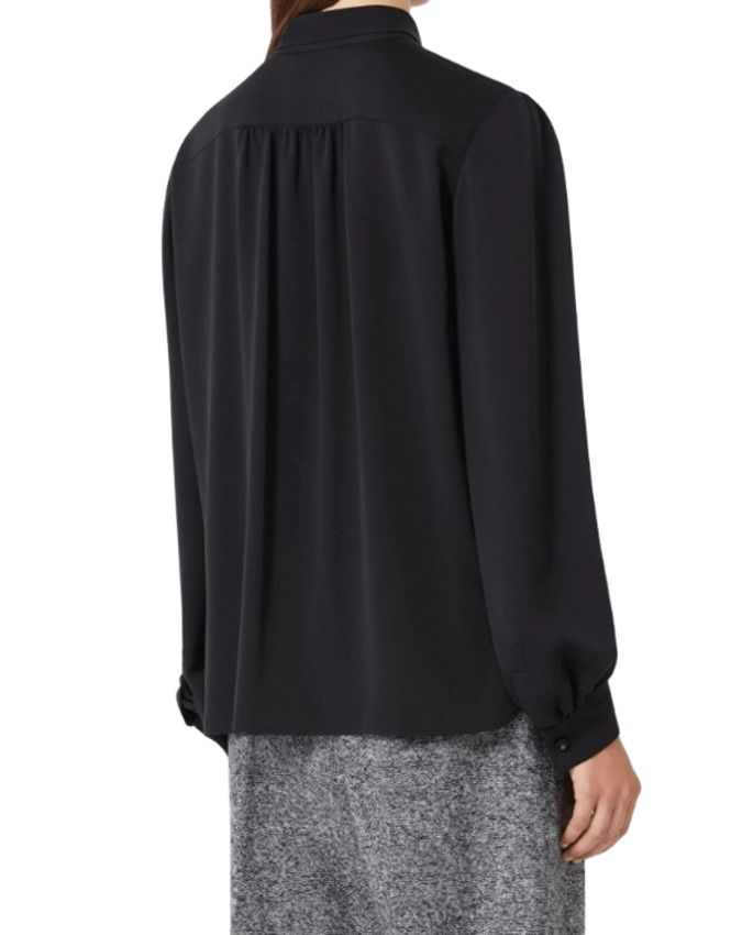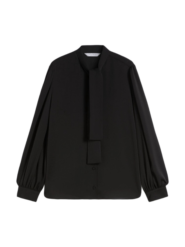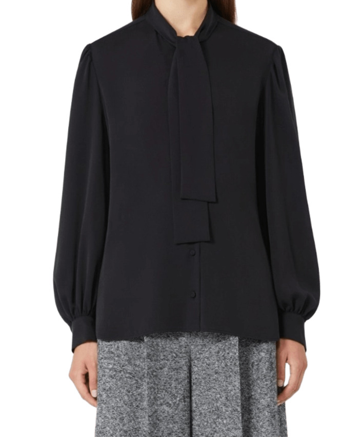 Camicia in charmeuse pesante di pura seta lavata con collo a foulard da annodare a fiocco sul davanti, maniche lunghe con leggero volume sulla spalla e sul fondo, polsino a camicia con bottone Monogram e chiusura frontale con bottoni a vista.