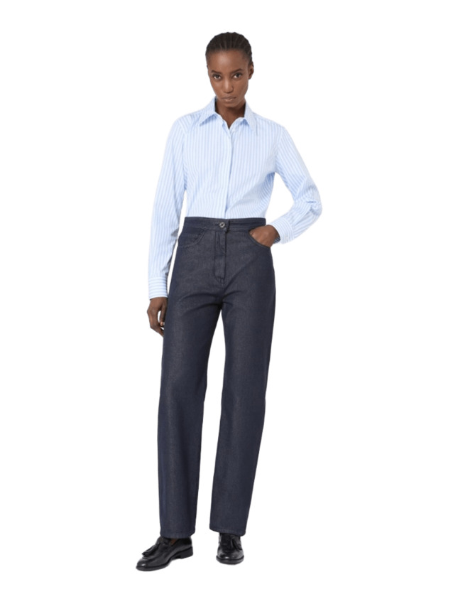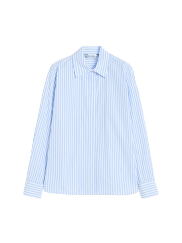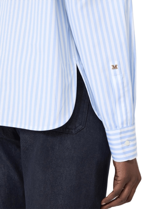 Camicia in popeline di puro cotone a righe con colletto a camicia, maniche a giro e polsini con rivetto "M" in metallo a camicia.