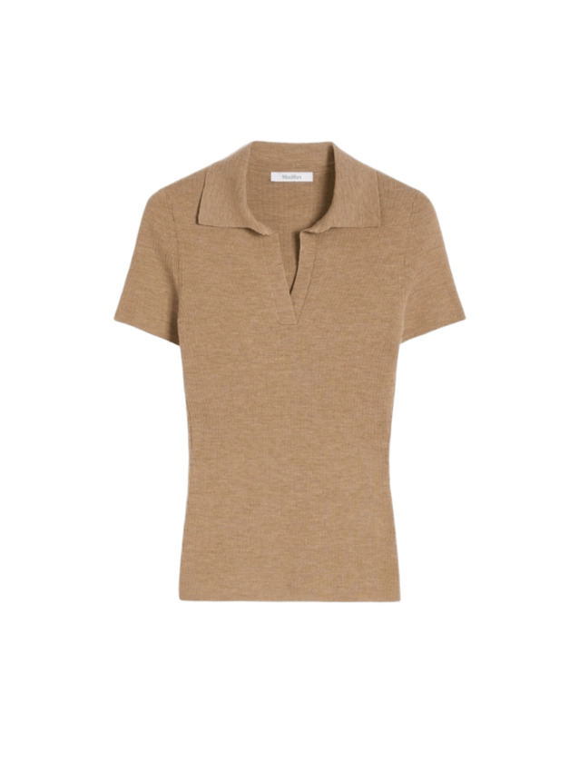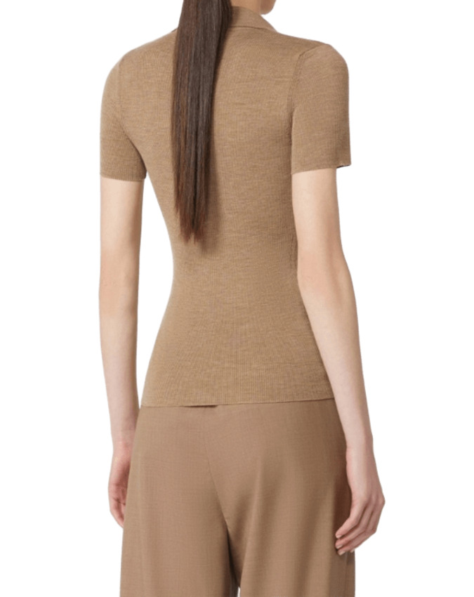 Polo in filato sottile di pura lana a maniche corte, interamente lavorata a coste. Colletto polo aperto sul davanti, maniche a giro, fondo dritto.