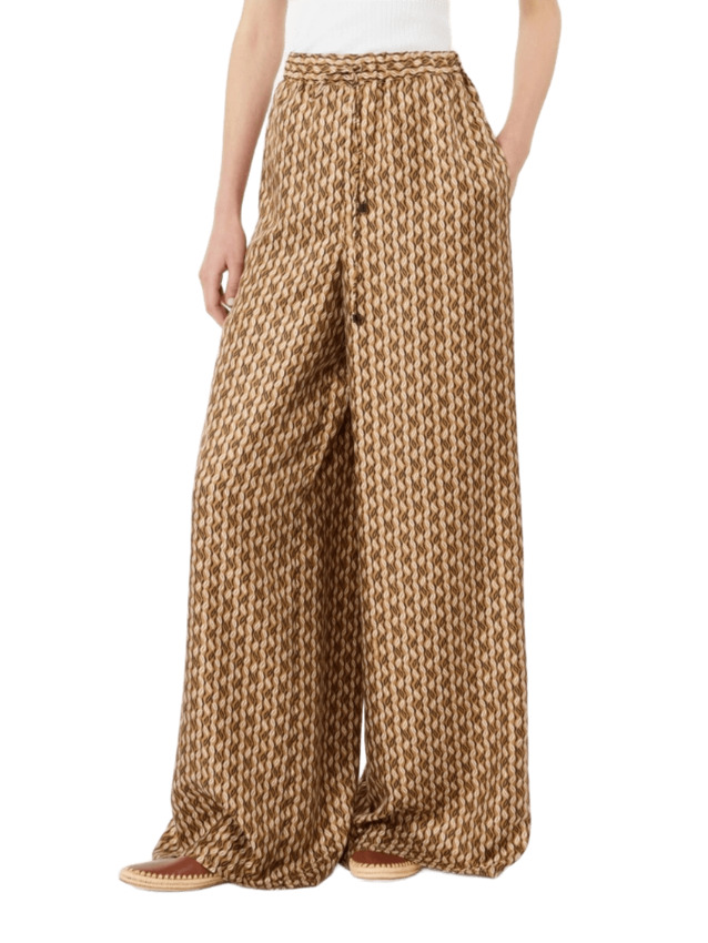 Pantalone wide leg dal carattere deciso, animato da un motivo di collezione stampato all over che ne esalta lo stile distintivo. Realizzato in twill di pura seta, si distingue per la sua texture fluida e luminosa. La gamba ampia crea una silhouette rilassata e sofisticata, mentre la vita elasticizzata con coulisse in tubolare e finalini in corno assicura comfort e una vestibilità regolabile. Le tasche inserite nei fianchi aggiungono praticità senza compromettere la pulizia del design. Un capo versatile e ricercato, perfetto per look contemporanei che uniscono comfort e raffinatezza.