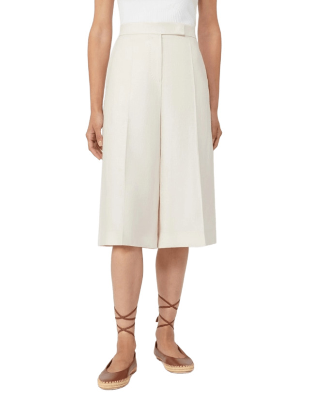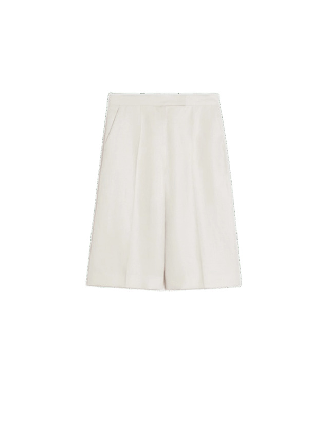 Bermuda dal taglio sartoriale realizzati in tessuto diagonale di puro lino, perfetti per un look raffinato e contemporaneo. Il design a gamba larga garantisce comfort e libertà di movimento, mentre il listino alto in vita valorizza la silhouette con un tocco elegante. Dotati di chiusura con zip coperta da patta e pratici gancetti, presentano tasche alla francese sui fianchi e tasche a filetto sul retro per unestetica pulita e funzionale. Le pinces cucite in vita sul retro e la piega stirata lungo la gamba completano il capo, donando struttura e unallure sofisticata. Ideali per outfit estivi curati, da abbinare sia a capi casual che più formali.
