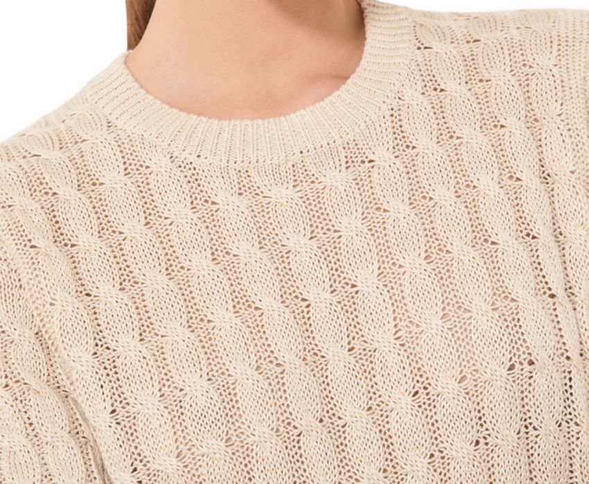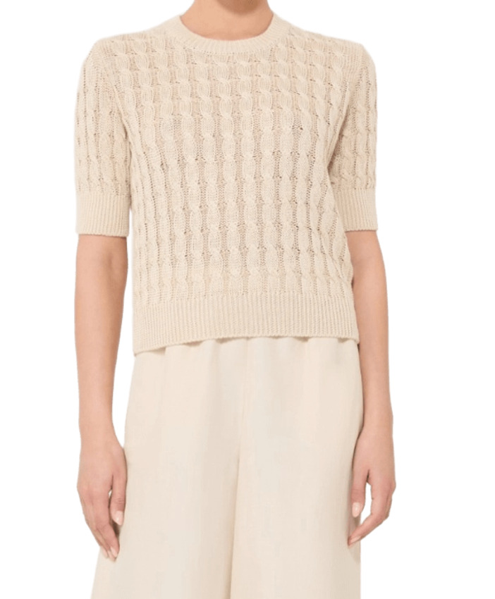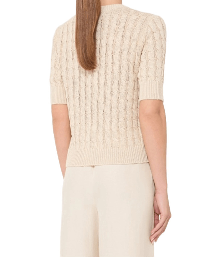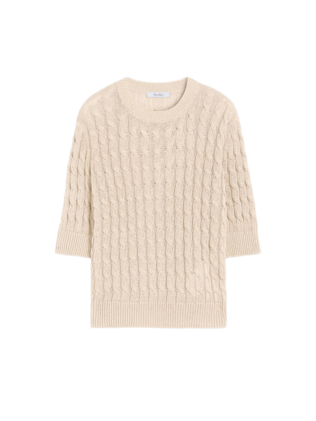 Maglia dal design essenziale e raffinato, caratterizzata da una lavorazione a treccia all over che ne valorizza la texture e la naturale eleganza. Realizzata in filato di puro lino, si distingue per la sua leggerezza e la freschezza tipica della fibra naturale. Il girocollo pulito e le maniche a giro lunghe sopra il gomito definiscono una silhouette equilibrata e versatile. Il fondo dritto e i bordi a coste completano il capo.