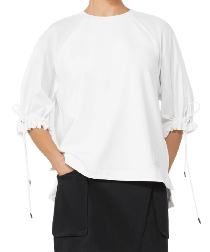 T-shirt dal design contemporaneo che unisce comfort e dettagli distintivi. Realizzata in jersey tecnico di misto cotone, presenta una linea dritta e un classico girocollo, perfetti per una vestibilità versatile e quotidiana. Le maniche corte raglan si distinguono per il fondo con coulisse regolabile, che richiama leffetto leggermente a palloncino in popeline di puro cotone, aggiungendo un tocco femminile e moderno. Gli spacchi laterali sul fondo donano maggiore libertà di movimento e valorizzano la silhouette, mentre la label logata in gomma applicata sul fondo frontale, lato sinistro, completa il capo con un dettaglio distintivo. Ideale per look casual ma curati, questa T-shirt si presta a essere abbinata facilmente sia a pantaloni che a gonne, per outfit dinamici e di tendenza.