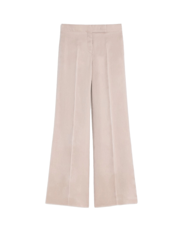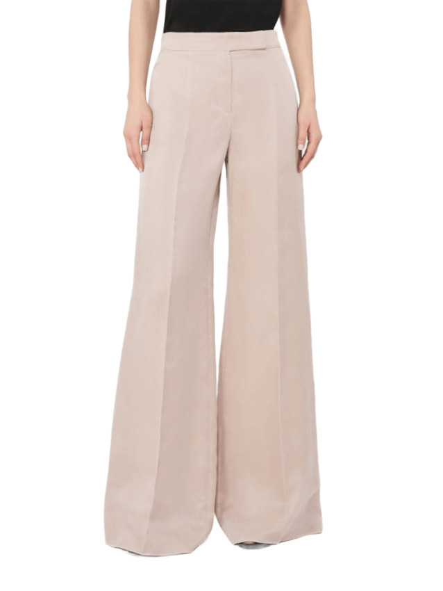 Pantalone lungo dalla silhouette elegante e contemporanea, caratterizzato da una gamba dritta che si apre leggermente al fondo per una linea fluida e armoniosa. Realizzato in pura seta. La vestibilità regular assicura comfort e naturalezza nei movimenti, mentre il listino alto in vita con chiusura a zip coperta da patta e gancetto definisce la silhouette con precisione. Le tasche inserite sui fianchi aggiungono praticità, mentre le tasche a filetto orizzontale con bottone sul retro completano il design con un dettaglio sartoriale. La piega stirata lungo la gamba enfatizza la verticalità della figura, mentre le pinces cucite in vita sul retro garantiscono una vestibilità impeccabile. Un pantalone sofisticato e versatile, ideale per look eleganti e contemporanei.