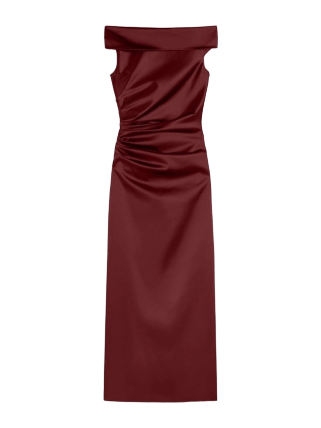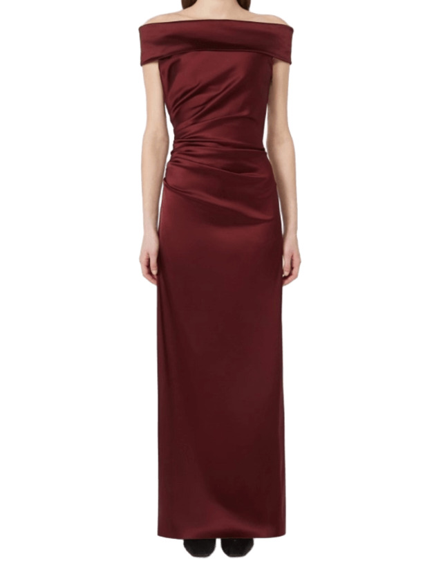 Abito lungo in raso stretch, caratterizzato da bustier drappeggiato in vita sul fianco destro e scollatura omerale. Presenta una linea aderente e femminile, chiusura con zip invisibile sul fianco.