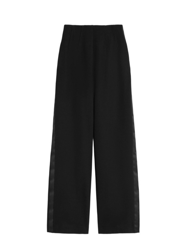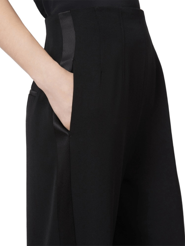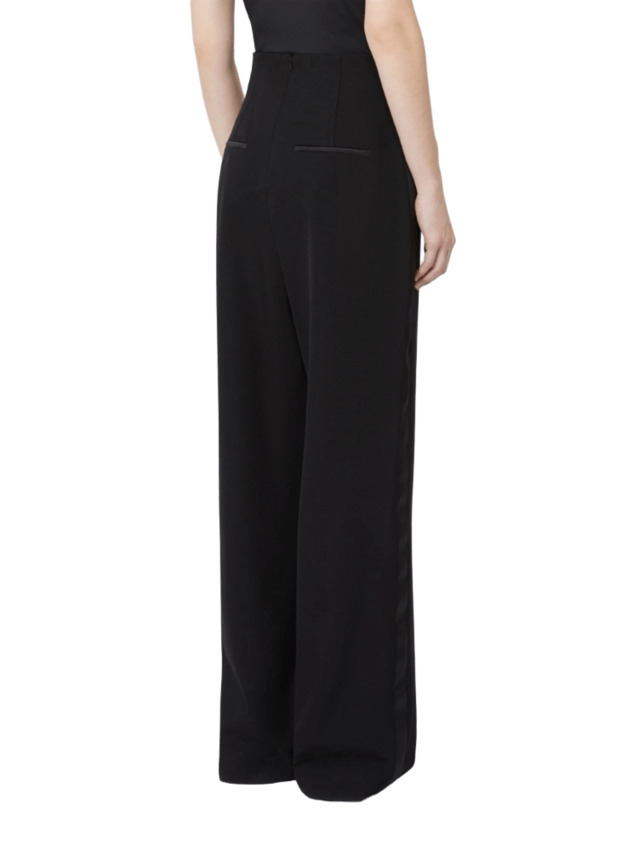 Pantalone lungo in gabardina di pura lana, mano organzata, caratterizzato da una silhouette a vita alta con dettagli tipo bustier sul davanti e sul retro. Presenta linea dritta, chiusura con zip invisibile sul retro, tasche inserite nei fianchi, tasche a filetto sul retro.