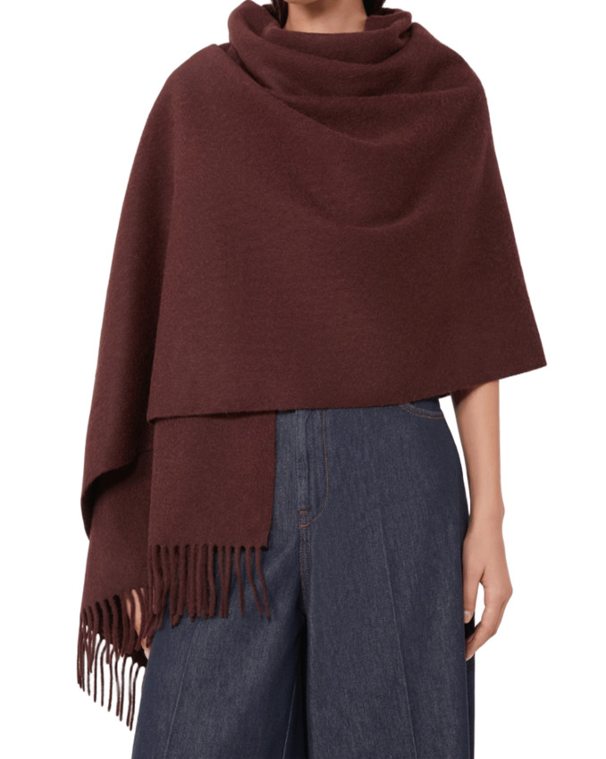 Stola da donna in puro cammello, franghe, colore ciliegia.