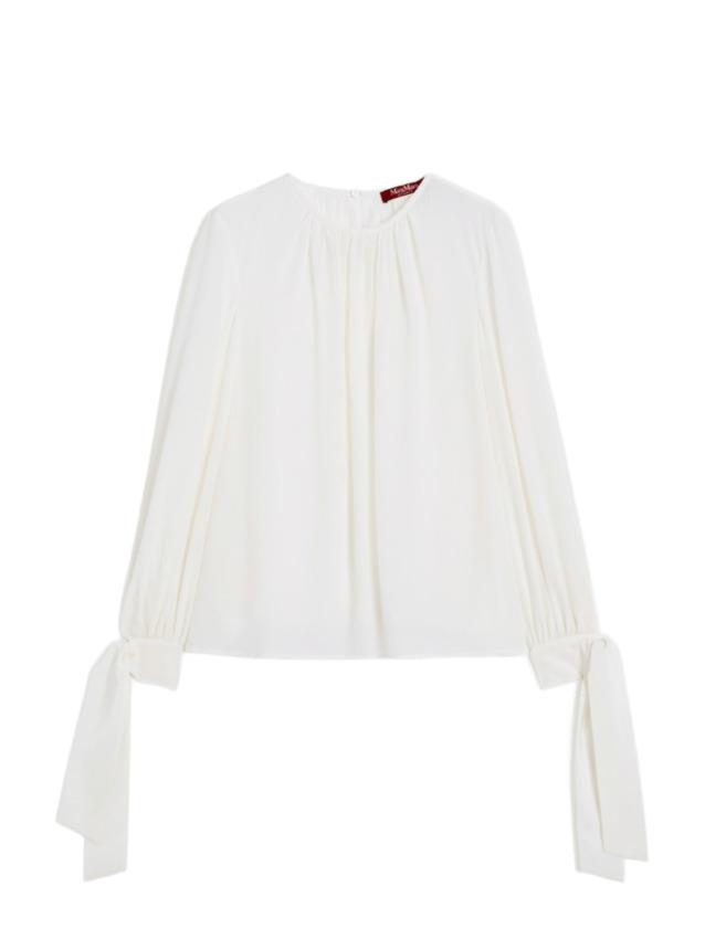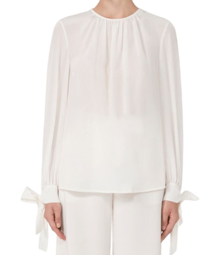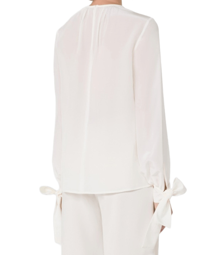 Blusa dfa donna in pura seta con maniche lunghe, polsini a nastro da annodare a fiocco, color avorio