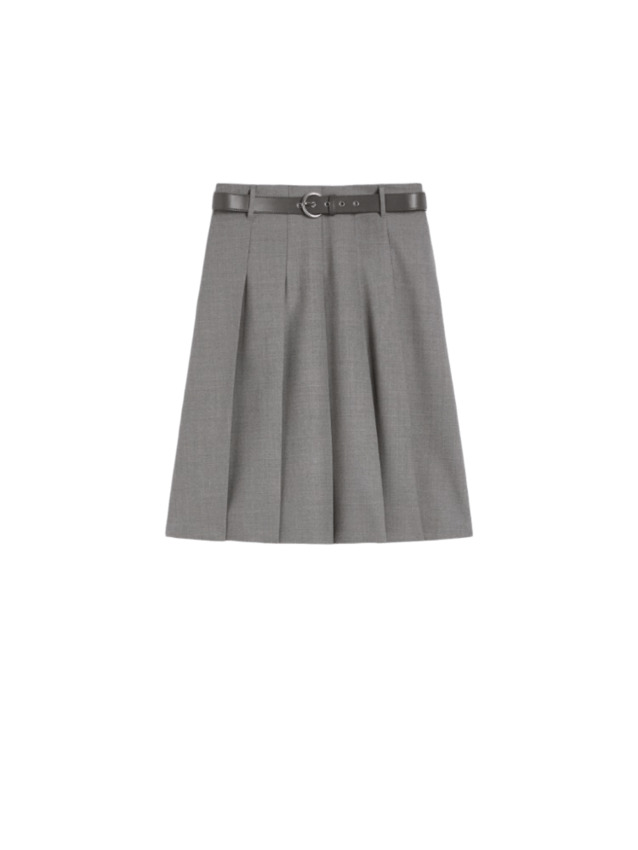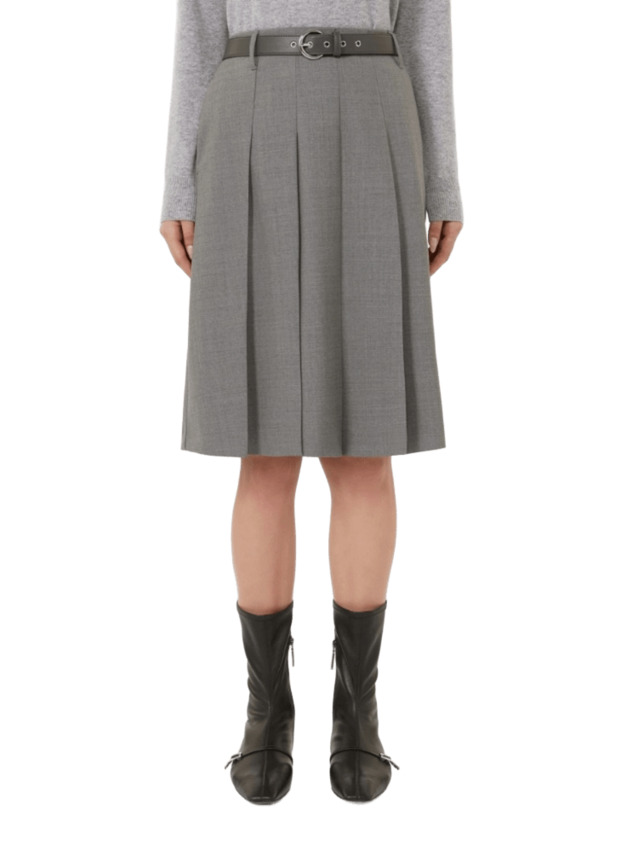 Gonna midi in lana stretch dalla silhouette sartoriale, caratterizzata da un motivo a pieghe e spacchi accuratamente nascosti. Un design pulito per un capo versatile, morbido e confortevole.