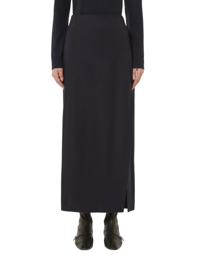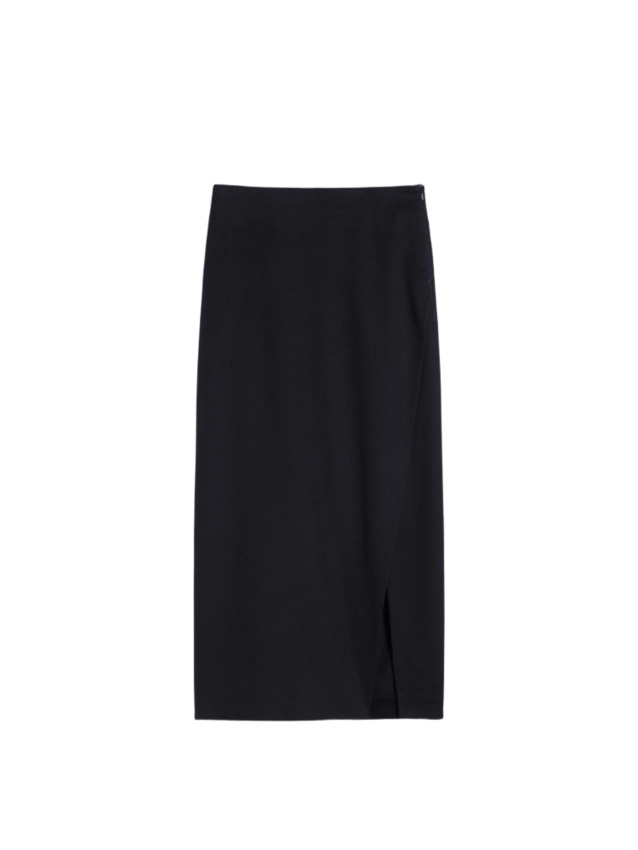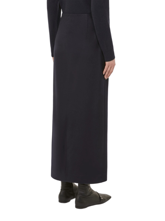 Gonna longuette in drap di pura lana a portafoglio con sovrapposizione sul davanti. Morbida e fluida, è costruita per seguire il profilo del corpo con precisione ed essenzialità. Presenta chiusura con zip laterale e pinces cucite in vita sul retro.
