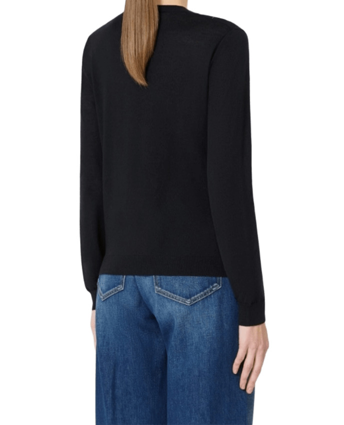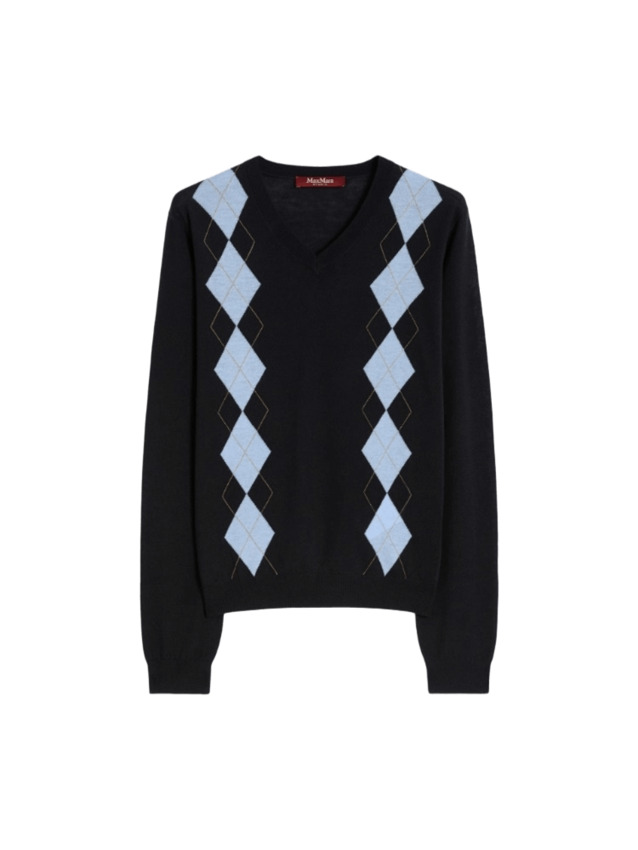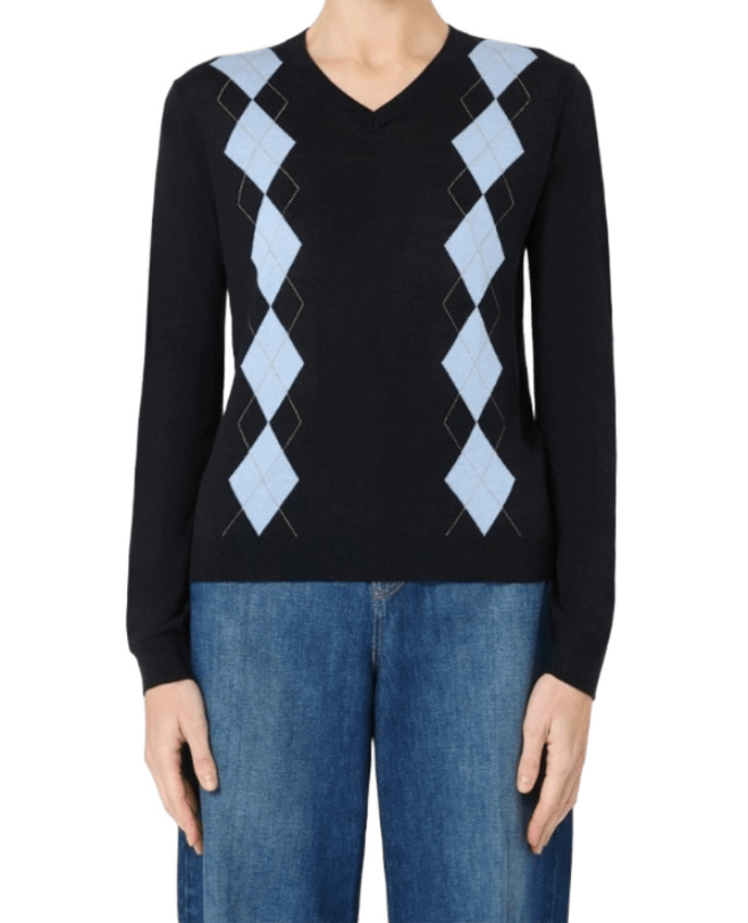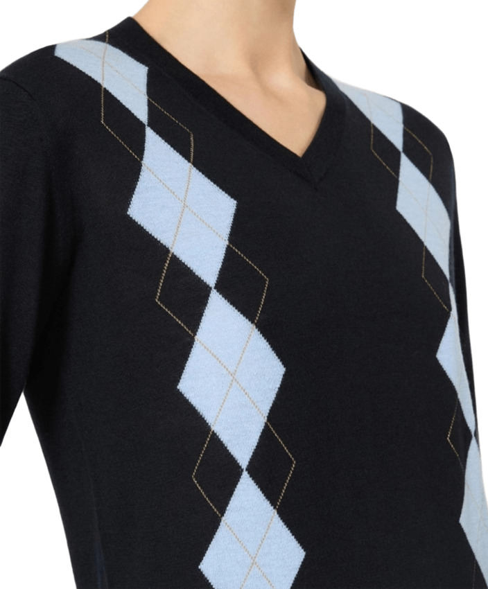 Maglia in filato di lana e seta decorata con disegno Argyle intarsiato sul davanti con filo di lurex. Presenta scollo a V, maniche lunghe a giro, schiena e maniche in maglia rasata e bordi rifiniti a costine.