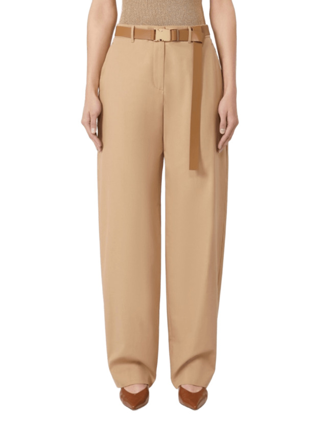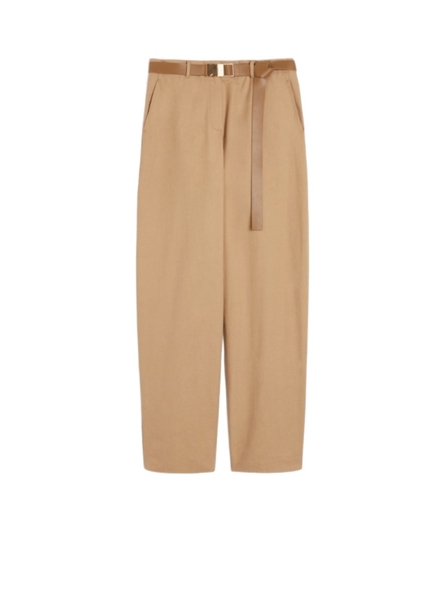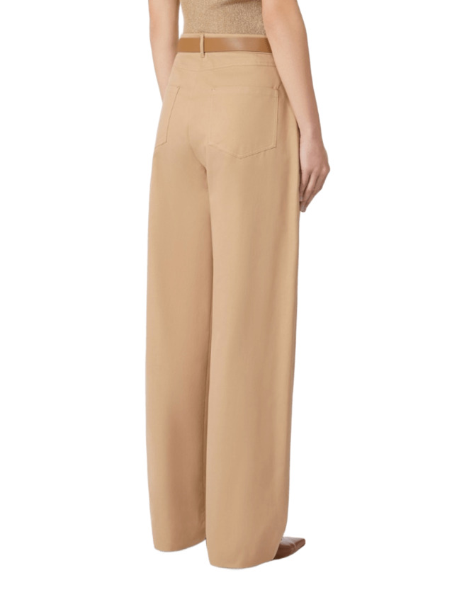 Pantalone da donna in puro cotone con gamba larga e linea leggermente affusolata al fondo, color cammello