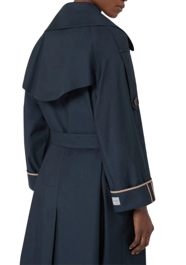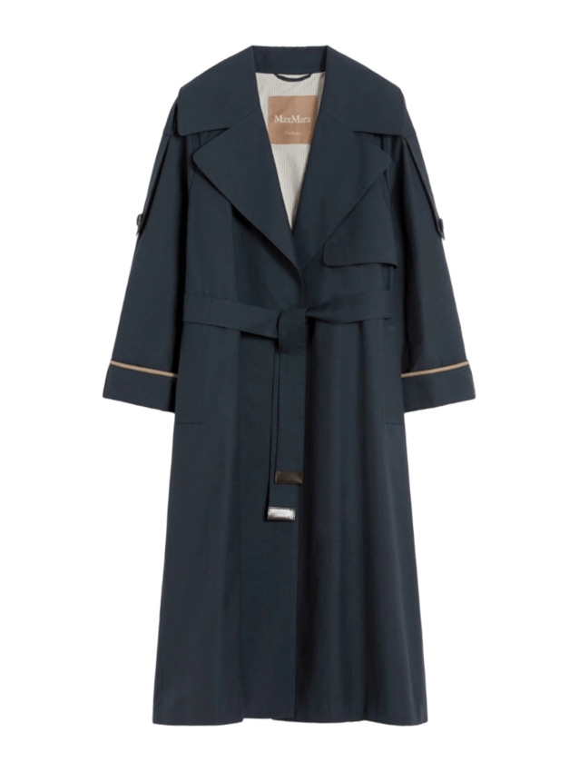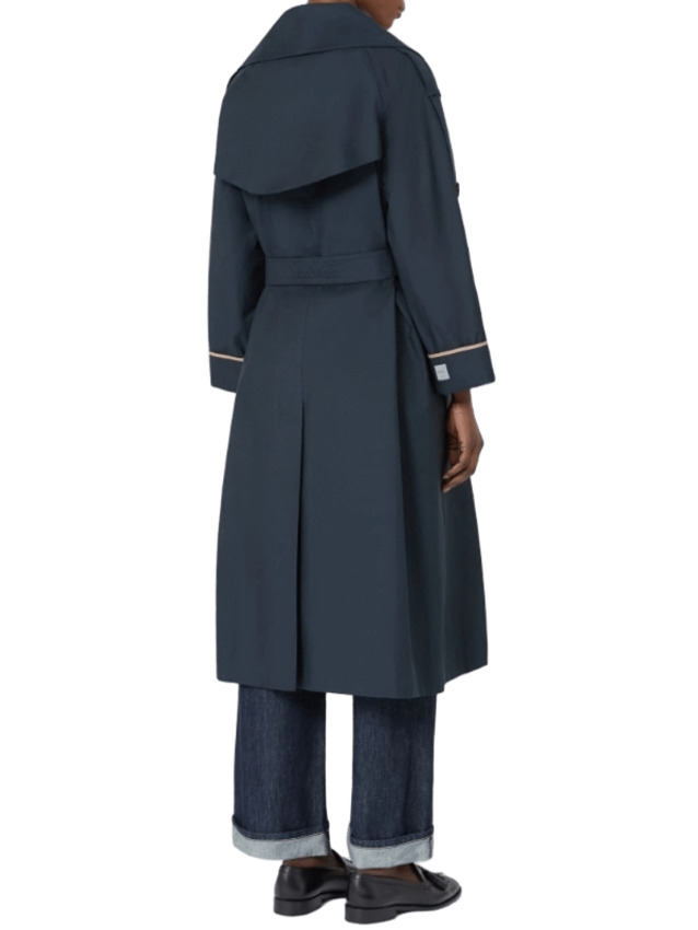 Trench lungo in twill di misto cotone antigoccia, a vestaglia, con cintura abbinata personalizzata, puntino sartoriale e bavolet frontale sul lato sinistro. Linea svasata con profondo spacco centrale sul retro, collo a rever ampio, maniche raglan con risvolto cucito e alamari sulle spalle.
