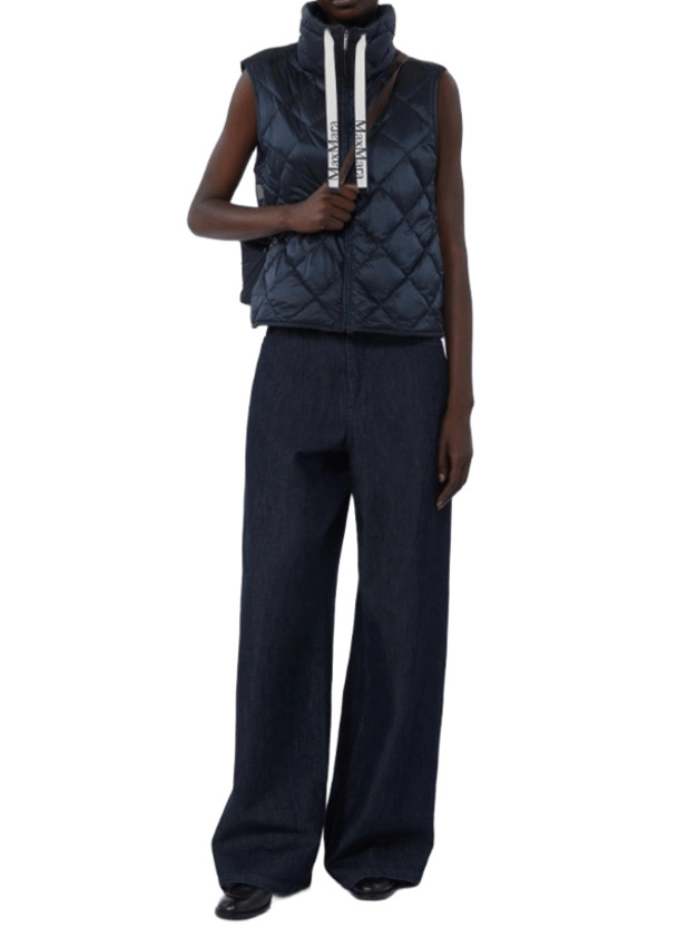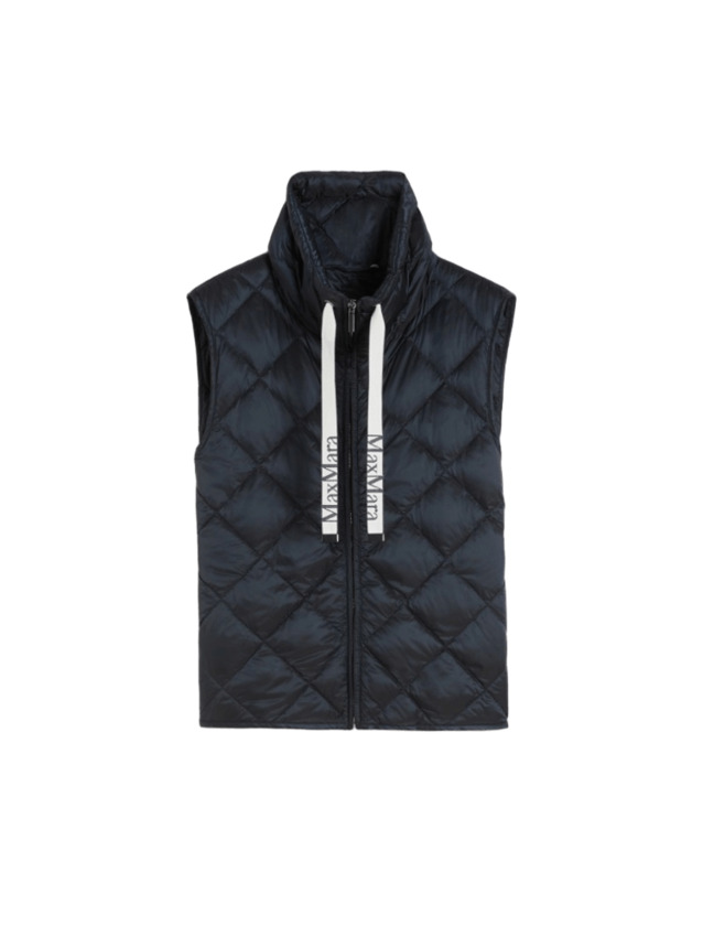 Gilet in tela di nylon cangiante antigoccia trapuntato a rombi, caratterizzato da collo alto a coulisse con nastri logati jacquard. Presenta chiusura frontale con zip, tasche inserite nei fianchi ed imbottitura in piuma d'oca.