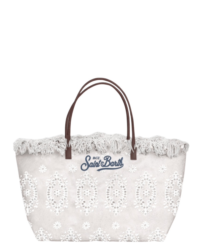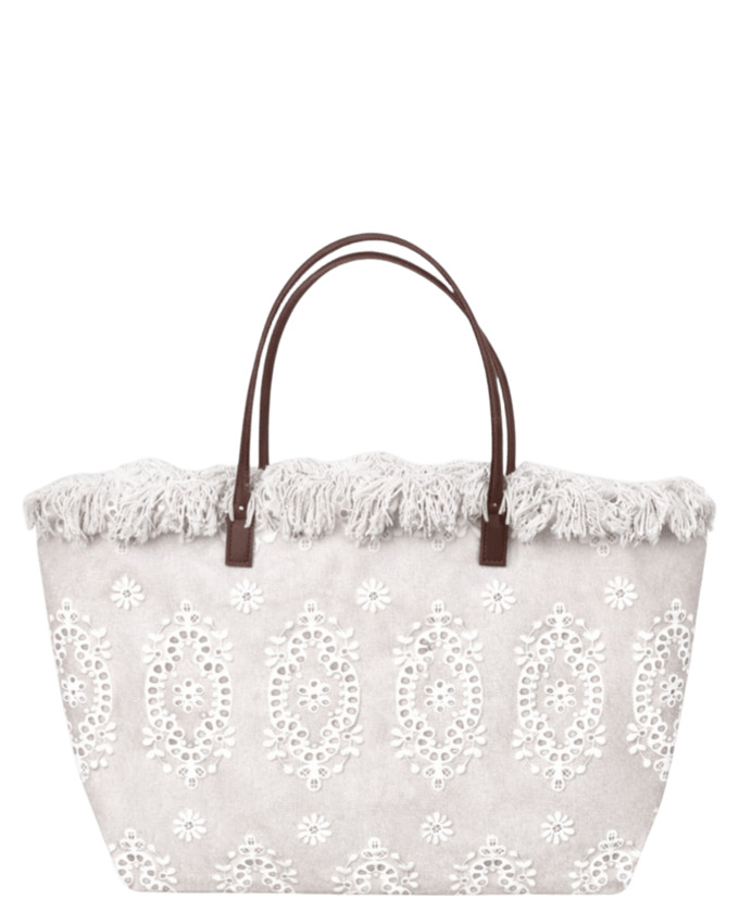 Questa City bag è laccessorio estivo perfetto che combina eleganza romantica e funzionalità. Realizzata in tessuto sangallo tinta unita, presenta una struttura morbida ma resistente, ideale per accompagnarti con stile dalla città al mare. Il bordo superiore con frange aggiunge movimento e un tocco distintivo, mentre il logo ricamato sul fronte valorizza il design con un dettaglio raffinato. Dotata di chiusura superiore con zip per una maggiore sicurezza e di una pratica tasca interna, è pensata per garantire ordine e praticità in ogni occasione. Versatile e chic, è ideale come borsa mare elegante, shopper da giorno o accessorio casual da abbinare a look estivi in lino, denim o abiti leggeri.