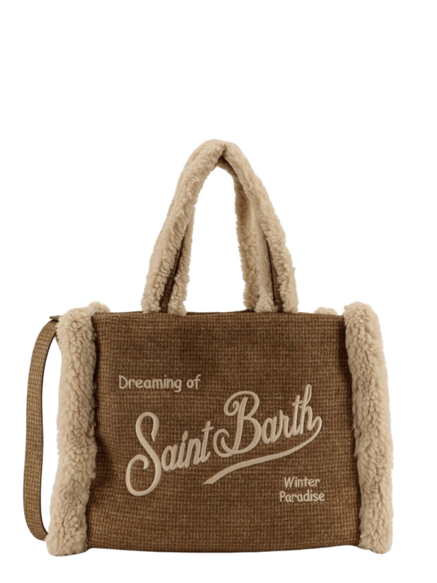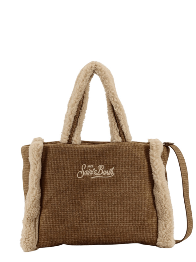 Due manici in sherpa e tracolla removibile e regolabile in tessuto, chiusura con bottone, una tasca interna con zip.