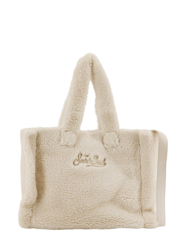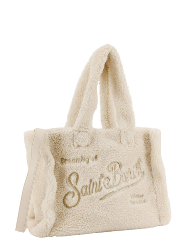 Due manici in teddy e tracolla in pelle amovibile e regolabile, chiusura con bottone, una tasca interna con zip