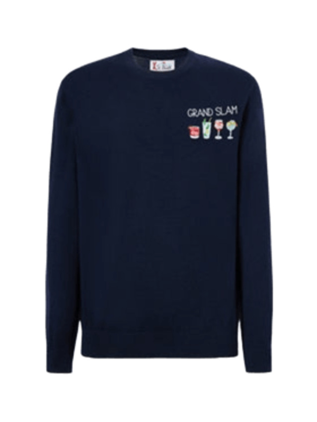 Maglione in misto lana rasata e cashmere a girocollo, maniche lunghe con fondo e polsi a coste e ricamo polso St. Barth.