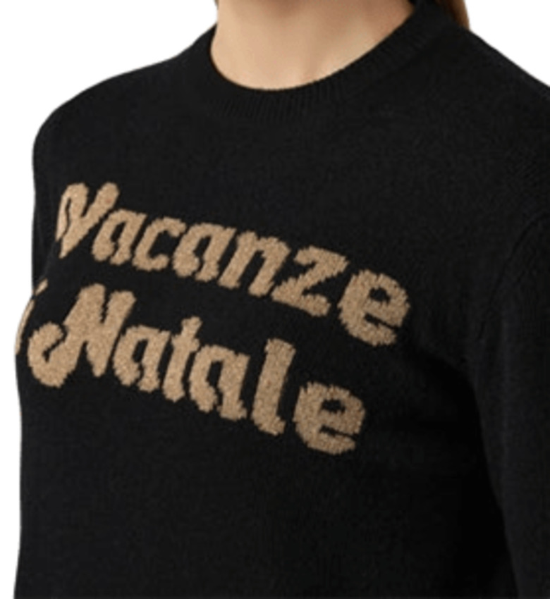 Maglia da donna in misto lana e cashmere, girocollo, jacquard lurex oro VACANZE DI NATALE sullo sfondo nero.