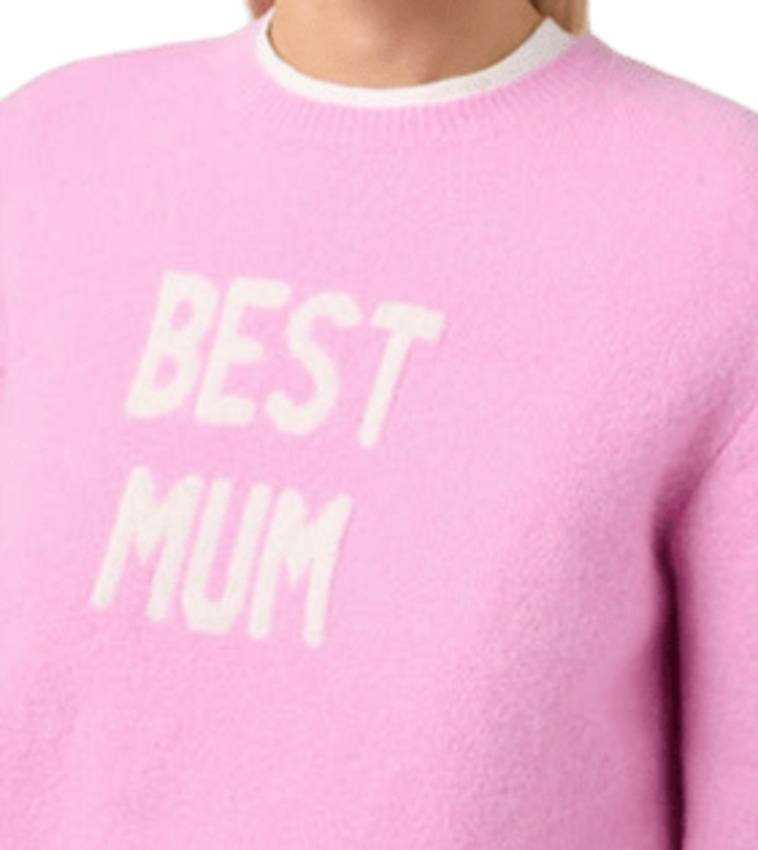 Maglia da donna in misto lana, girocollo, jacquard BEST MUM in bianco sullo sfondo rosa.