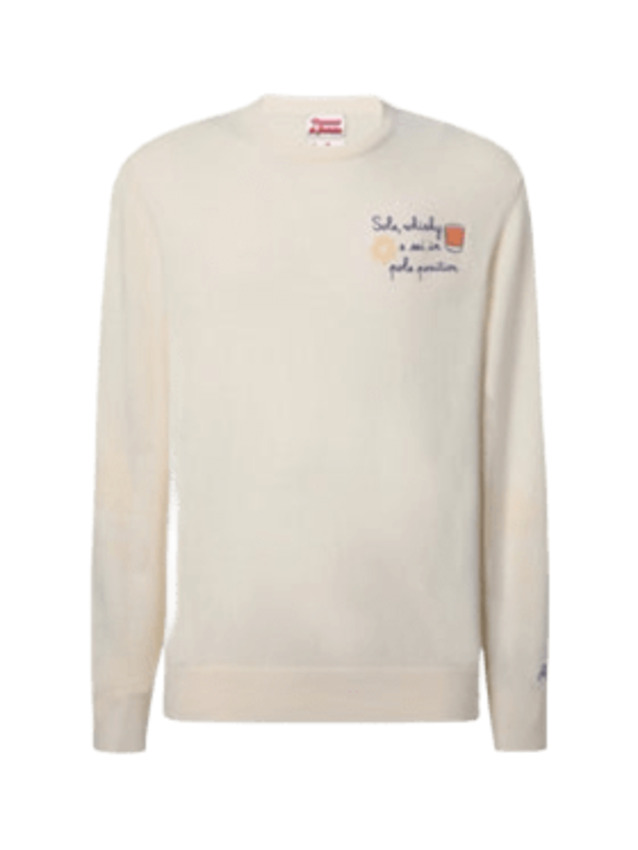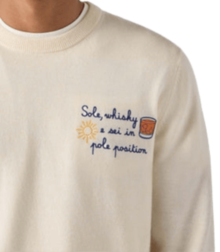 Maglione da uomo in misto lana e cashmere, girocollo, ricamo SOLE, WHISKY E SEI IN POLE POSITION, color avorio.