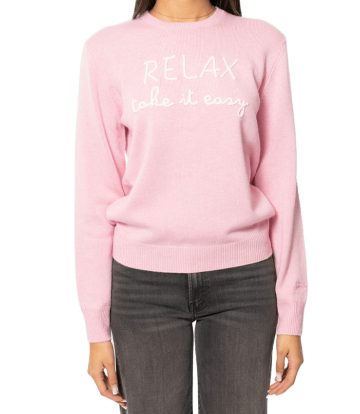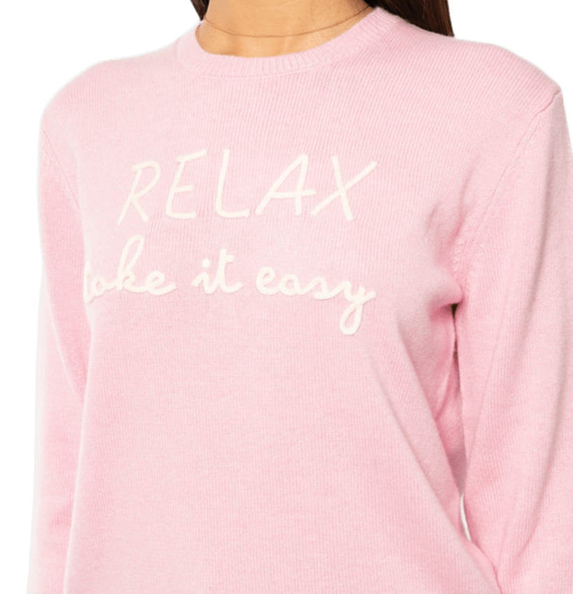 Ricamo a cordonetto bianco RELAX TAKE IT EASY sullo sfondo rosa.