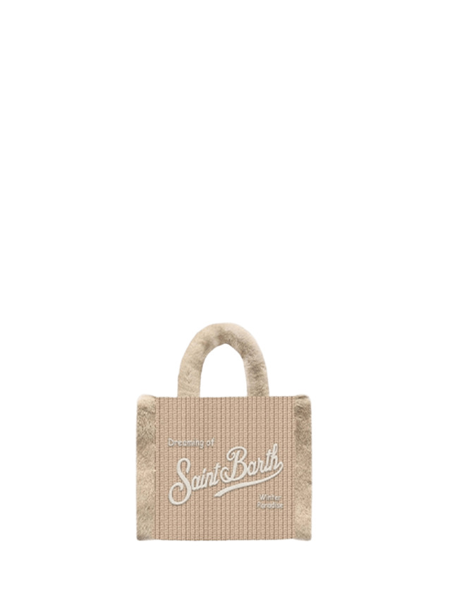 Borsa a mano in tessuto lavorato a maglia con profili in tessuto effetto shearling, ricamo logo fronte e retro, doppio manico fisso, chiusura bottone a pressione interna, fodera, tracolla regolabile e removibile.