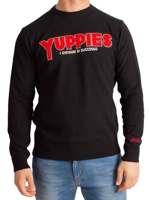 Jacquard frontale rosso e biancoYUPPIES I GIOVANI DI SUCCESSO sullo sfondo nero.